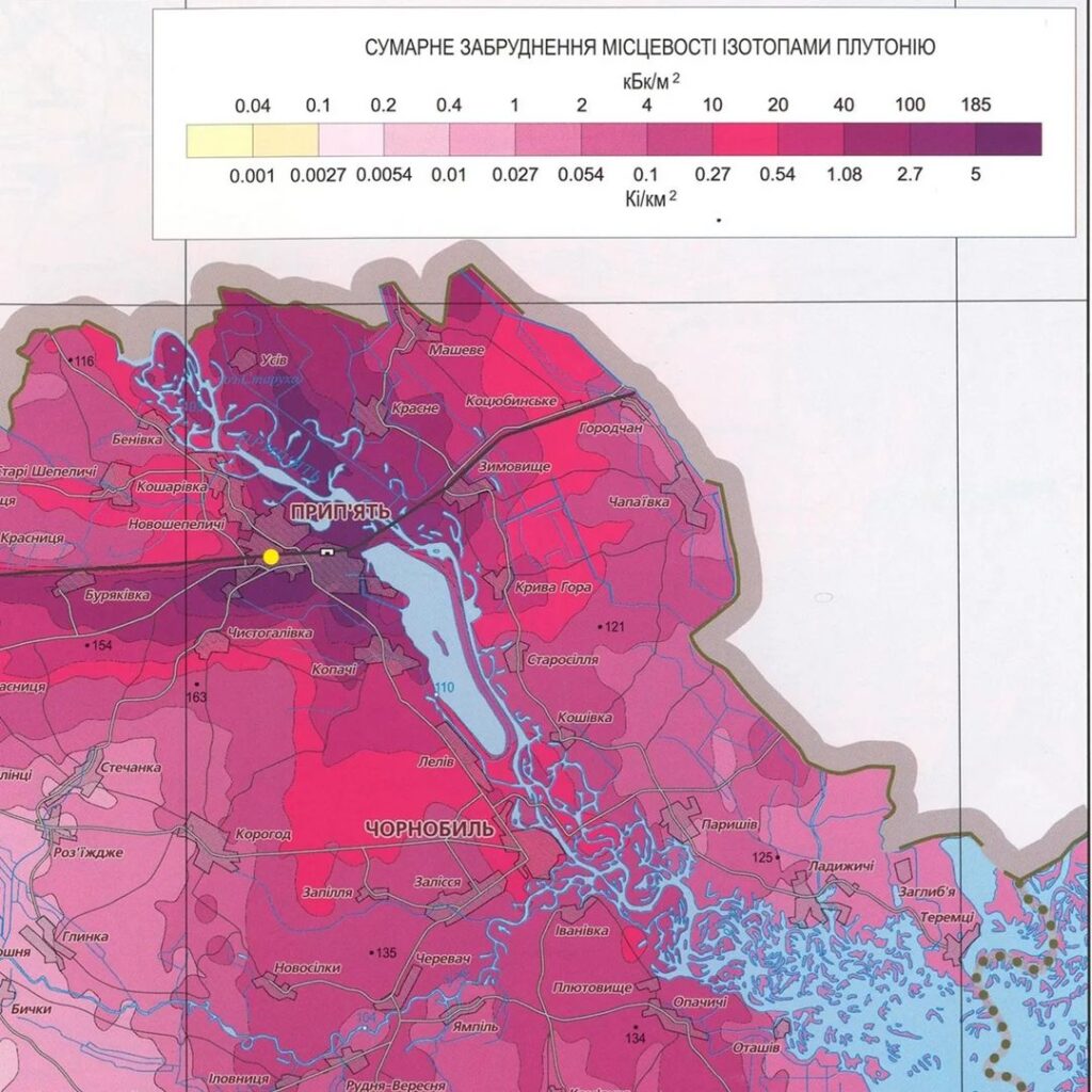 Співробітники НАЕК «Енергоатом» обстежили місце розташування окопів російських окупантів та порівняли з картограмою забруднення Чорнобильської зони відчуження станом на 2011 рік (місце розташування окопів позначено жовтою точкою).