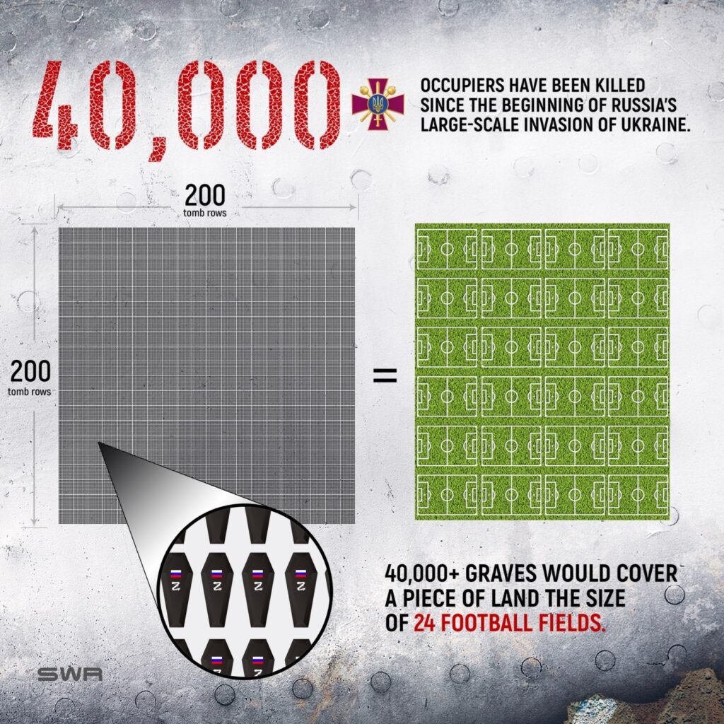 Станом на четвер, 28 липня, в Україні було ліквідовано близько 40 070 російських військовослужбовців. Щоб поховати всіх знищених військових рф, буде потрібна ділянка землі розміром із 24 футбольних поля, – йдеться на сторінці Міністерства оборони України в Twitter.