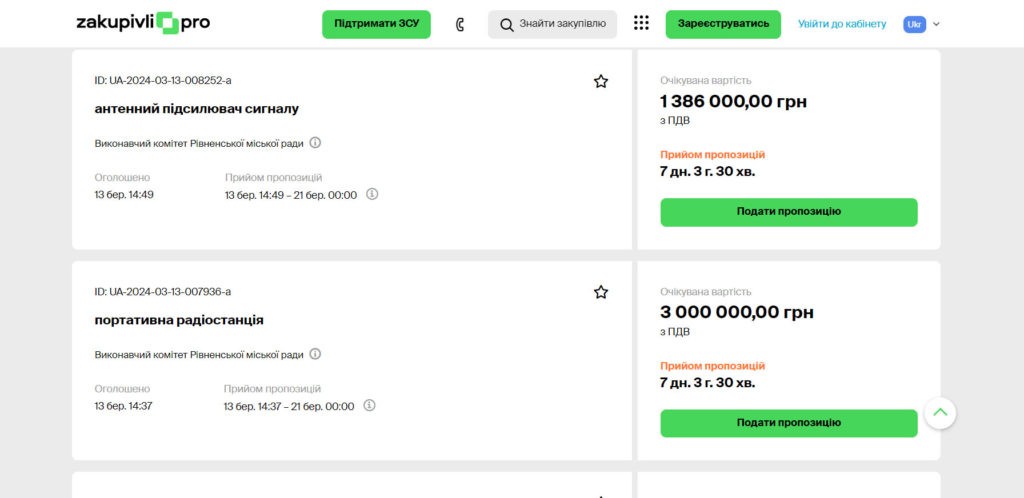 Тендери оголошено на 3 мільйони гривень на 100 штук портативних радіостанцій та 1 386 000 гривень на 30 антенних підсилювачів сигналу підсилювачів. Аукціони відбудуться 21 березня.