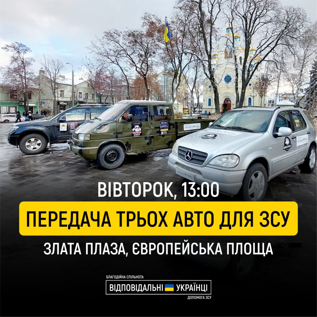 У вівторок, 22 листопада, о 13:00 на площі біля “Злата Плаза” відбудеться передача одразу трьох автомобілів для ЗСУ. Її організувала благодійна спільнота “Відповідальні Українці“.