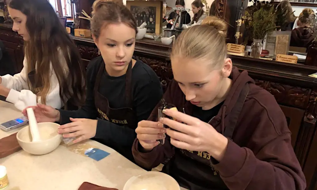 Учні 9-Б класу Рівненського ліцею «Український» долучилися до доброчинного майстер-класу з виготовлення живильного крему, який відбувся в аптеці-музеї ТДВ «Рівнефармація».