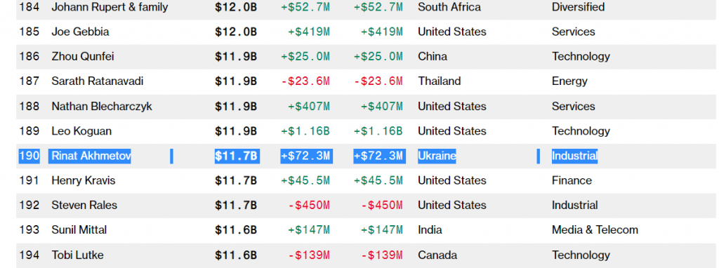 Український бізнесмен Рінат Ахметов зайняв 190 місце серед найбагатших людей світу за версією Bloomberg на початок 2022 року. Ахметов є єдиним українцем у рейтингу.