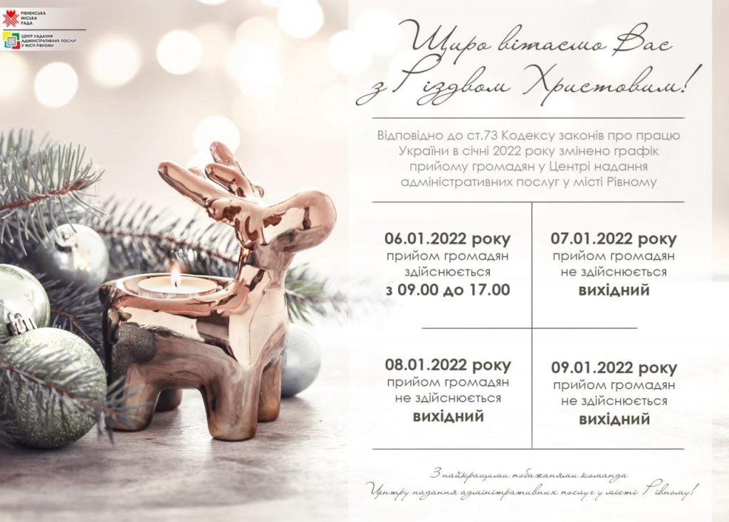 Графік роботи Центру надання адміністративних послуг у місті Рівному змінено у січні 2022 року відповідно до ст.73 Кодексу законів про працю України.