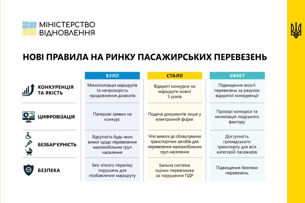 Зокрема, максимально спрощено вихід перевізників на маршрути, підвищено вимоги до якості послуг, створюються умови для відкритої конкуренції.