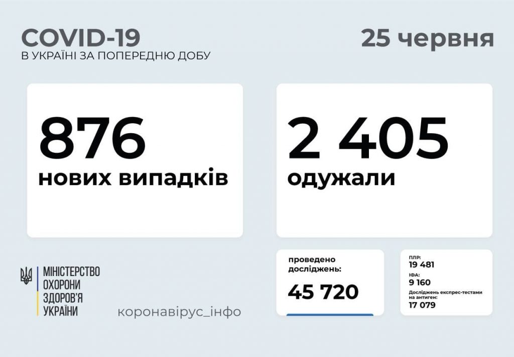 876 нових випадків коронавірусної хвороби COVID-19 зафіксовано в Україні станом на 25 червня 2021 року.
