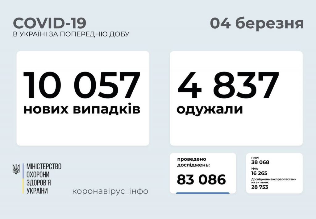 10 057 нових випадків коронавірусної хвороби COVID-19 зафіксовано в Україні станом на 4 березня 2021 року. Зокрема, захворіли 611 дітей та 388 медпрацівників.