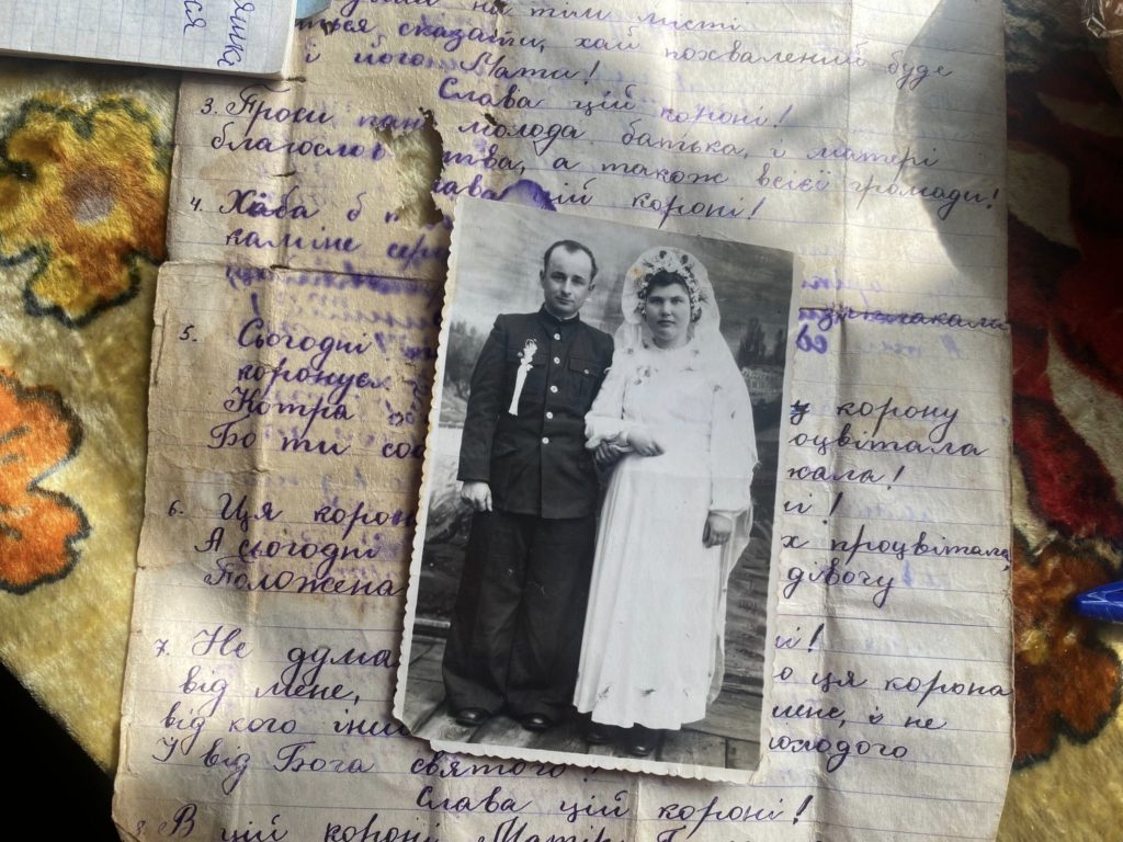 Жінка до сьогодні зберігає свій весільний вінок і корону – двометрову стрічку, зав’язану трьома бантами. Спочатку тримала це все в іконі Богородиці, як і годиться всім жінкам там зберігати ці атрибути. А недавно Віра Василівна зняла їх, бо «готується померти», то, згідно з традицією, просить рідних покласти все це у труну.