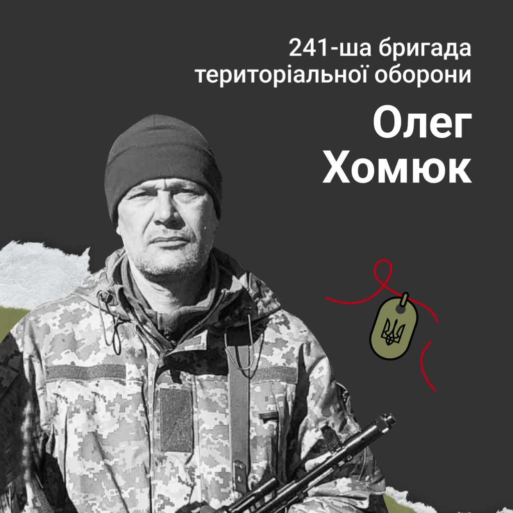 Солдат Олег Хомюк, позивний «Хома», загинув 2 березня 2023 року на Донеччині під час виконання бойового завдання. Разом із сином Микитою перебували на спостережному пункті біля дороги із Бахмута до Слов’янська. Вночі російські війська почали обстріл позицій українських захисників. Танковий снаряд влучив у бліндаж. Батько із сином загинули. Олегові був 51 рік, а Микиті – 25.
