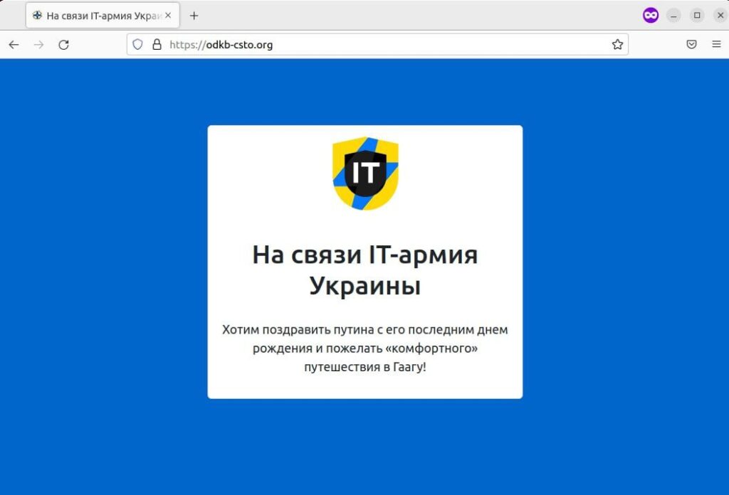 Сьогодні на сторінці ОДКБ з’явилося повідомлення: “На зв’язку ІТ-армія України. Хочемо привітати путіна з його останнім днем народження та побажати “комфортної” подорожі до Гааги”.