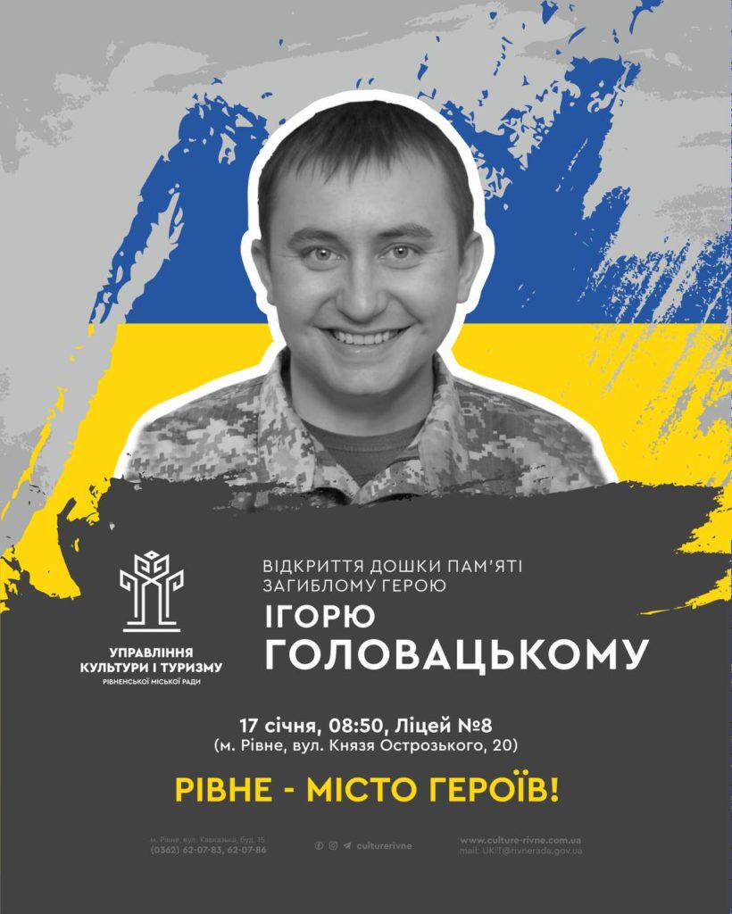 Сьогодні, 17 січня, на фасаді Рівненського ліцею №8 відкрили меморіальну дошку на честь загиблого Героя, випускника закладу. Ігоря Головацького.
