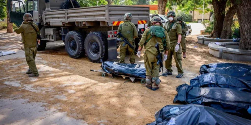 Фото: Ізраїльські солдати виносять тіла в кібуці Кфар-Аза, поблизу кордону з Газою, на півдні Ізраїлю (Хаїм Голдберг/Flash90).