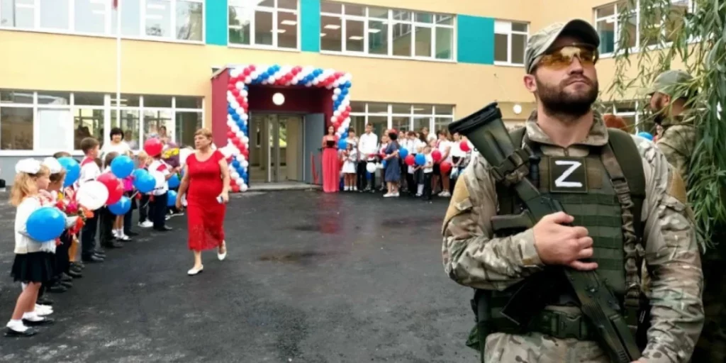 Так, окупанти організовують виступи воєнних злочинців перед українськими дітьми у місцевих дитсадках. З самого малечку дітей змушують слухати ґвалтівників, грабіжників, найманців й інші окупантів з віддалених районів імперії.