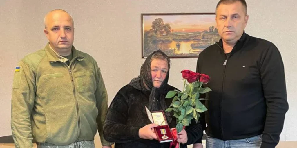 Начальник 3-го відділу Рівненського РТЦК СП, підполковник Мирослав Садовнік разом із сільським головою Сергієм Пилипчуком, вручили нагороду мамі загиблого Героя Ользі Михайлівні Трусик.