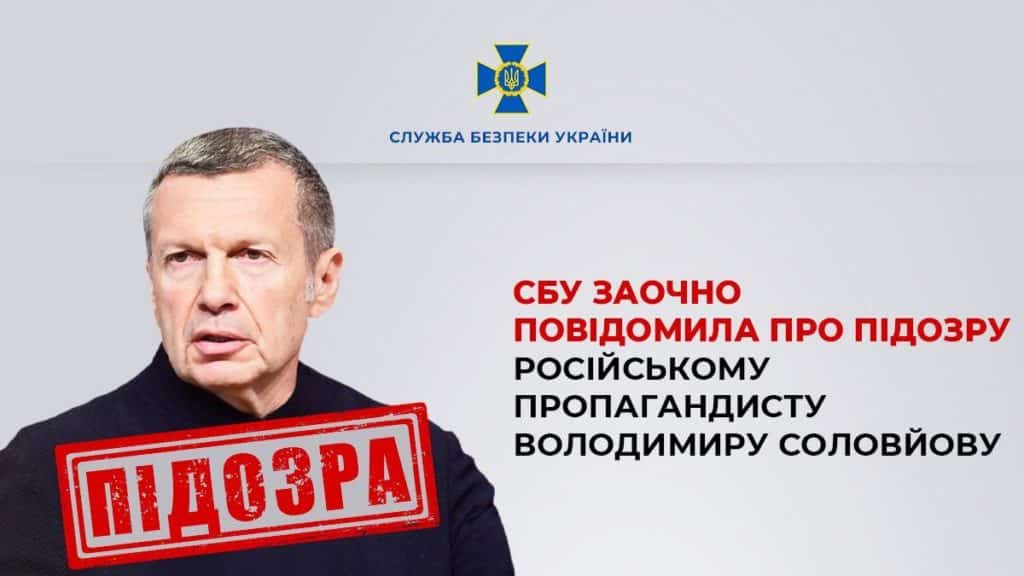 Служба безпеки України зібрала докази злочинної діяльності російського пропагандиста соловйова, який відкрито підтримує агресію рф проти України, виправдовує воєнні злочини та закликає до геноциду українців.