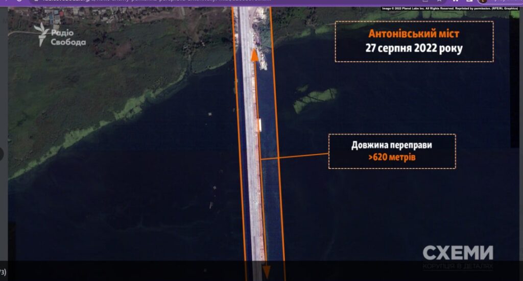 27 серпня супутник Planet Labs зафіксував процес будівництва окупантами понтонної переправи поблизу пошкодженого Антонівського моста: довжина зведеного мосту сягає понад 620 метрів.