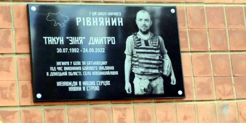 Сьогодні у Рівному на фасаді 17-ої школи у Рівному відкрили меморіальну дошку на честь Героя України Дмитра Такуна, як символ вдячності й пам’яті перед тим, хто без жодних вагань вступив у боротьбу з окупантами за свободу свого народу, своєї країни.