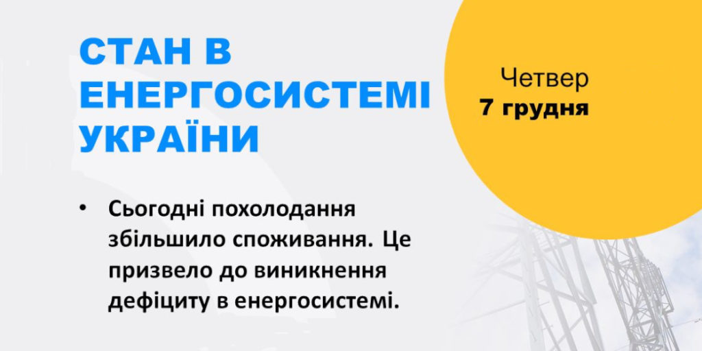 Сьогодні, 7 грудня, похолодання збільшило споживання. Це призвело до виникнення дефіциту в енергосистемі.