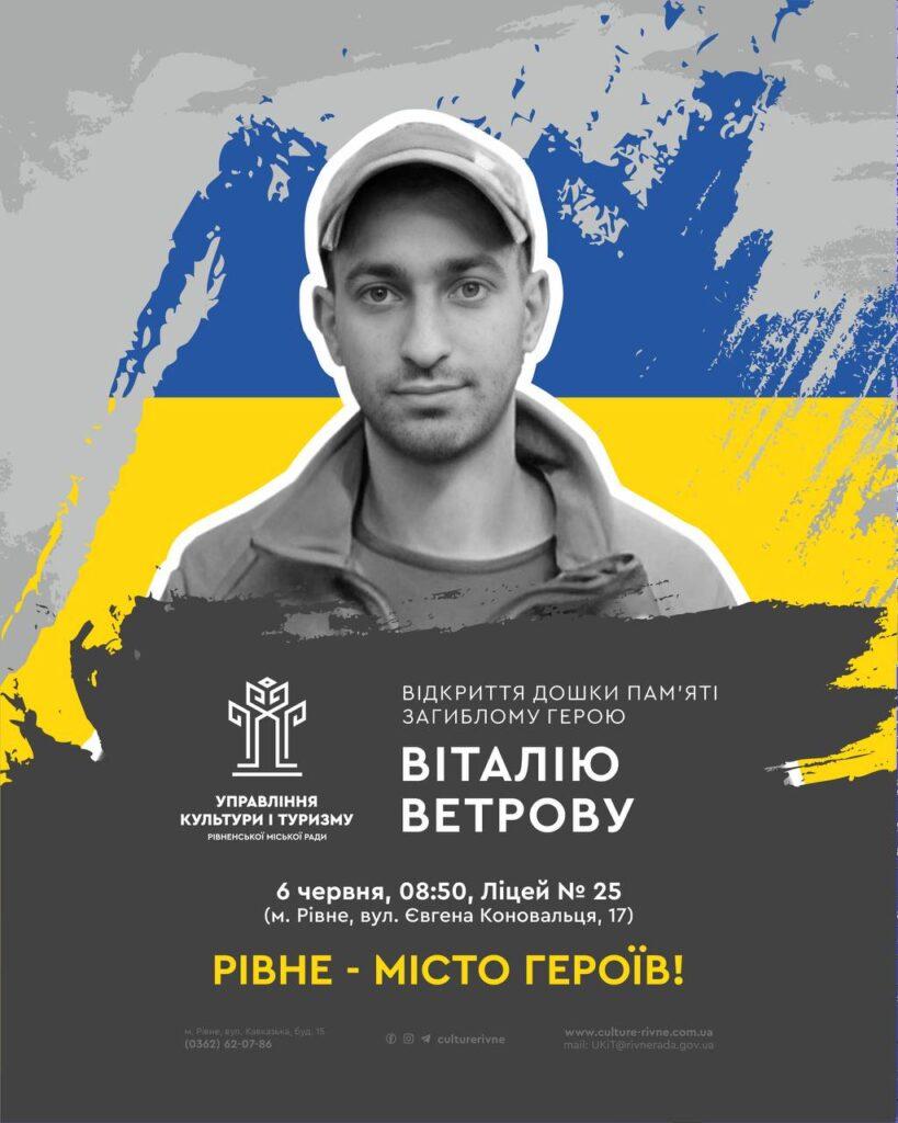 Завтра, 6 червня, о 8:50 у стінах Рівненського ліцею №25 пролунає хвилина тиші. У цей момент на фасаді закладу з’явиться новий символ пам’яті — меморіальна дошка на честь загиблого воїна Віталія Ветрова.