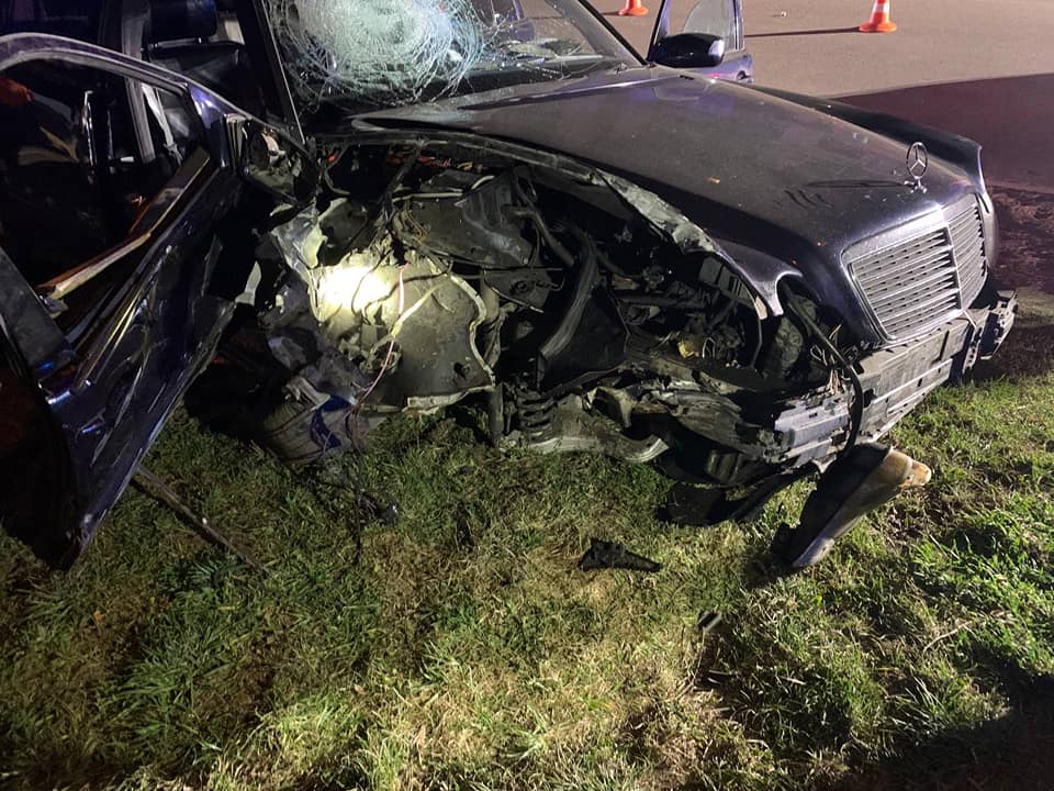 На місці ДТП рятувальники побачили на газоні понівечений легковий автомобіль марки Mercedes після зіткнення з бетонною електроопорою.
