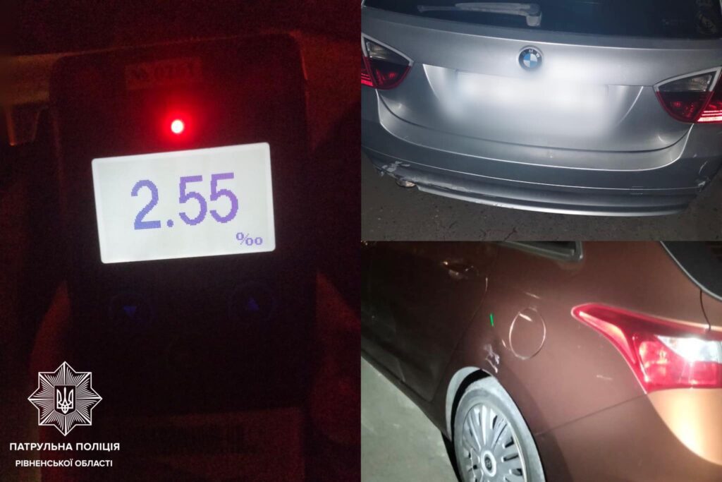 Патрульні розшукали учасника автопригоди – водія з Рівного. Він був з ознаками алкогольного сп’яніння. Патрульні отримали інформацію, що на вулиці Соборній сталася ДТП — BMW здійснив наїзд на припаркований автомобіль Hyundai. Постраждалих немає. Водій BMW, не зупиняючись, поїхав з місця пригоди.