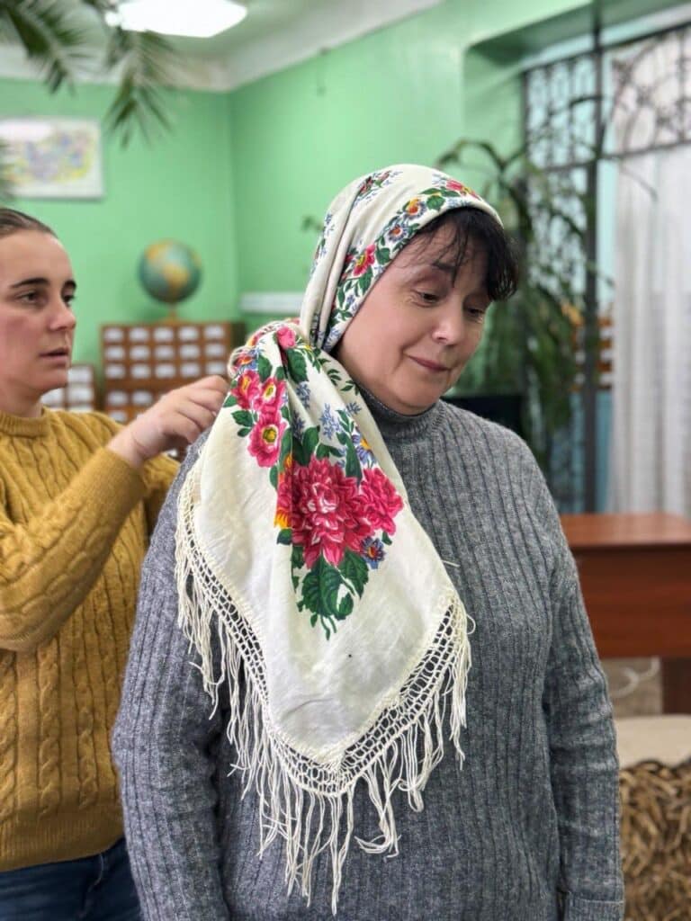 Визнана майстриня народних ремесел Людмила Рябунець, яка знає понад 20 способів зав’язування хустки на голові, провела захопливий майстер-клас. Учасниці із задоволенням повторювали рухи й дізнавалися, як одним рухом перетворити звичайну хустку на елегантний головний убір чи стильний аксесуар.