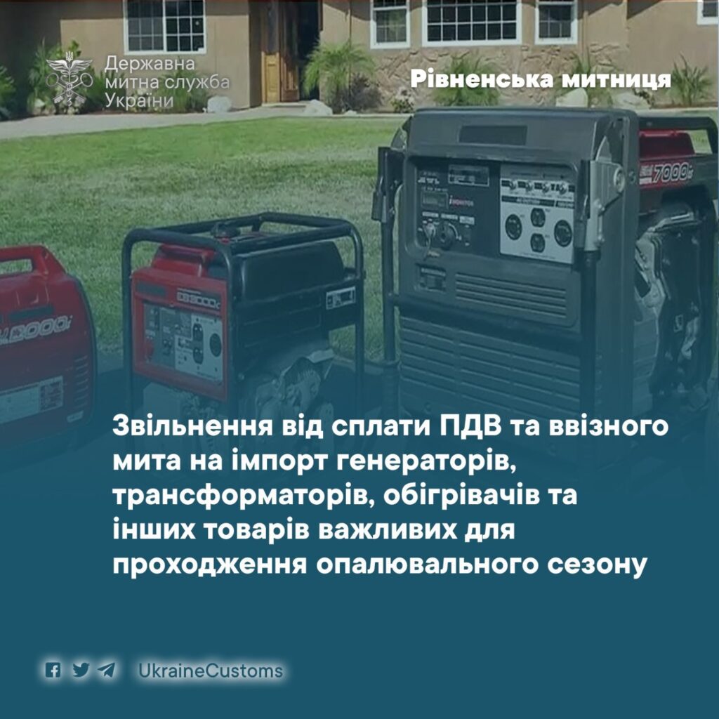 Ввіз генераторів – рівненська митниця надає інформацію про звільнення від сплати ПДВ та ввізного мита на імпорт генераторів, трансформаторів, обігрівачів та інших товарів важливих для проходження опалювального сезону.
