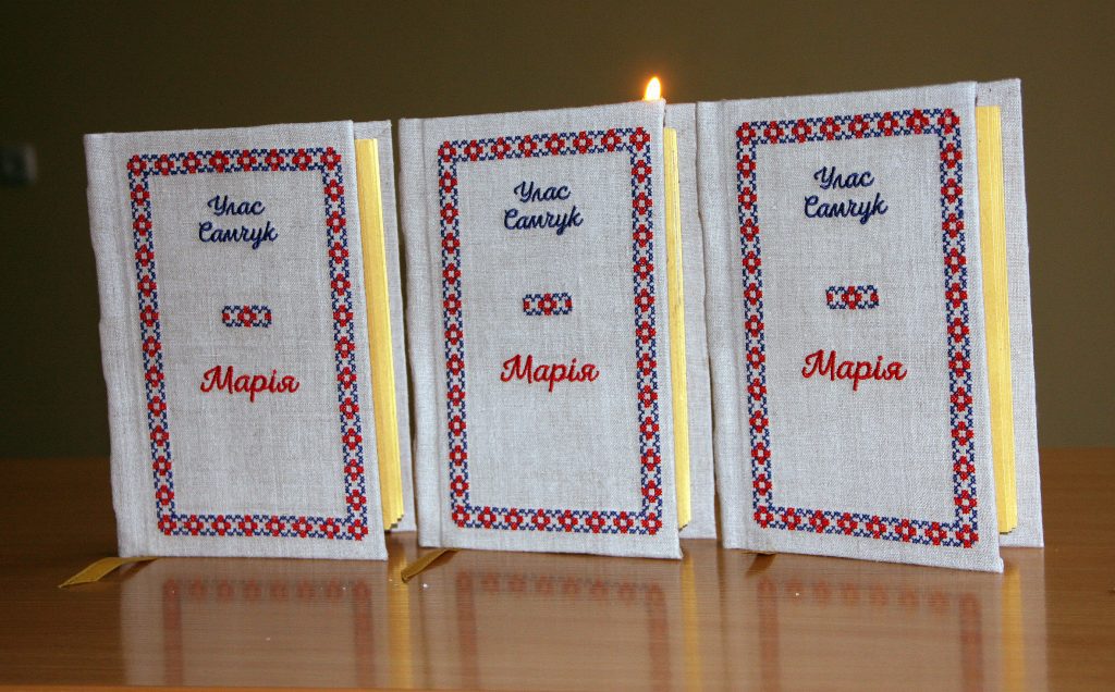 Вишила Олена Медведєва і два примірники цього ж формату з кількома розділами роману українською. Таким чином вона вперше випустила з-під своєї голки вишиваний «тираж» – із трьох примірників «Марії».
