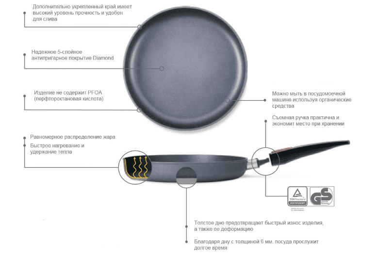 Основа сковорідки виготовлена з потовщеного литого алюмінію, це мінімізує деформації металу при екстремальних температурах. Верх виробу покритий декількома шарами антипригарного покриття з включенням наночастинок титану.