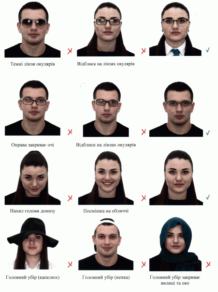 Фотографуючись дивіться прямо, очі – відкриті, вираз обличчя – нейтральний, рот – закритий, голова та шия – без повороту та нахилу. Допустимий макіяж обличчя світлих, неяскравих відтінків. Але дітей віком до 3-х років фотографування допускається без нейтрального виразу обличчя, вони можуть посміхатися. А ще діток можна фотографувати лежачи або в дитячому чи спеціальному сидінні.