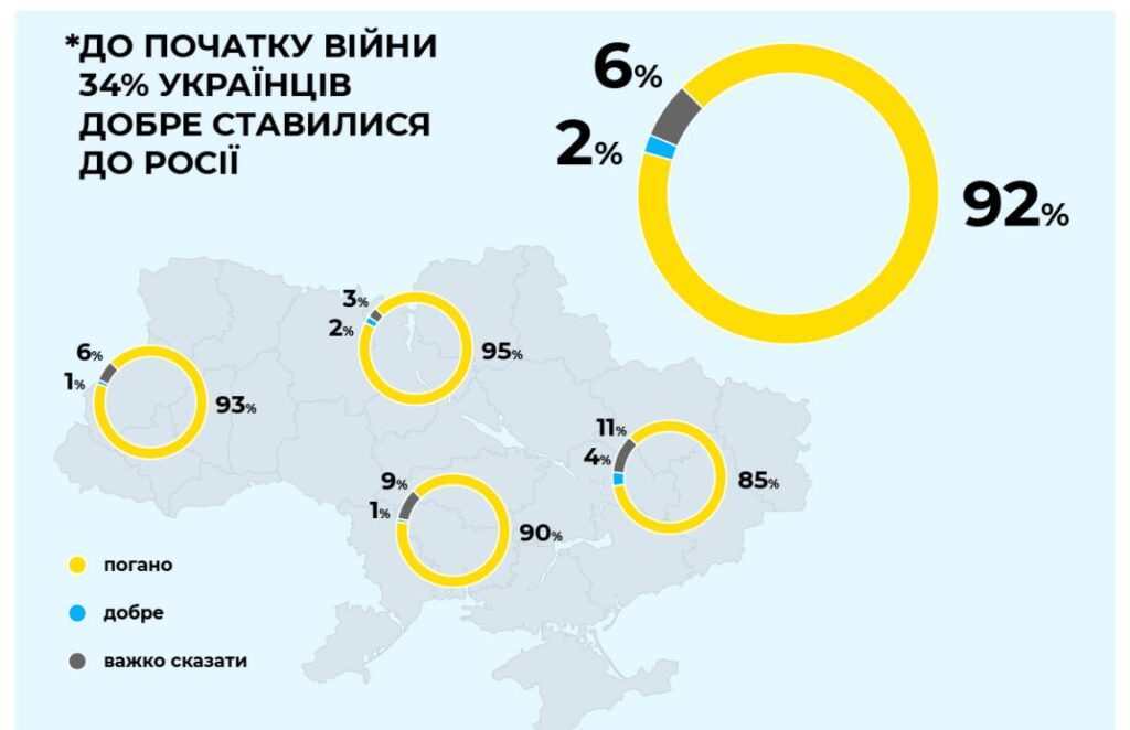 Нині 92% українців негативно ставляться до росії. Погане ставлення до рф на майже однаково високому рівні спостерігається у всіх макрорегіонах України.