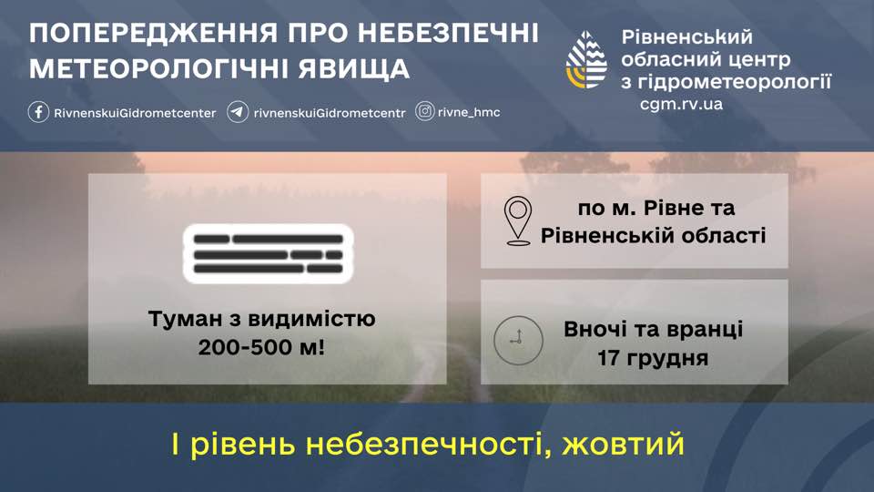 Синоптики надали прогноз погоди для Рівненщини на 17 грудня. У середу буде мінлива хмарність. Без опадів. Через туман вночі та вранці з обмеженою видимістю, оголошено I рівень небезпеки.