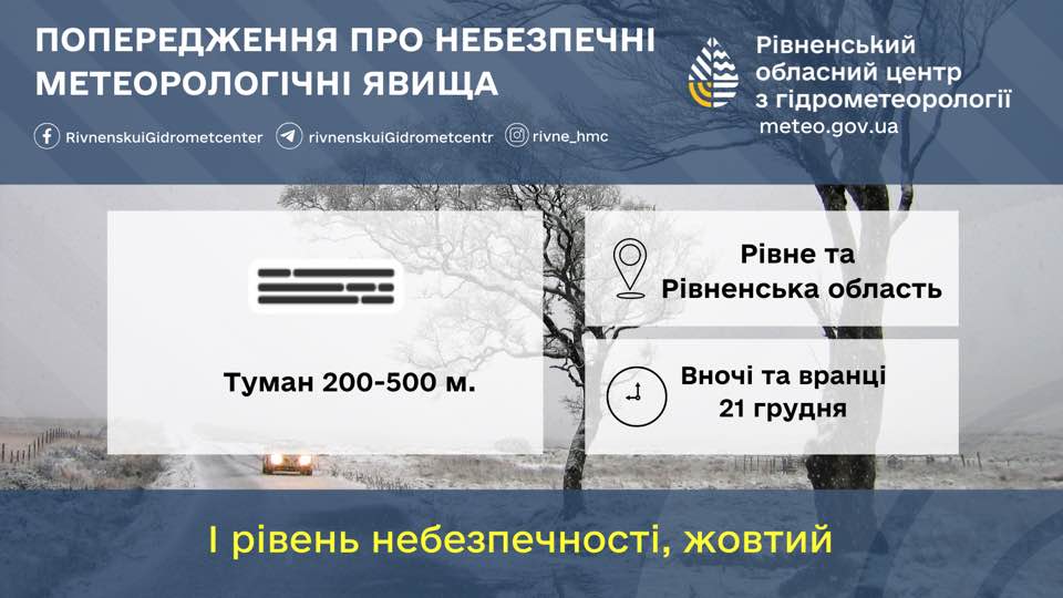 Синоптики надали прогноз погоди для Рівненщини на 21 грудня. У неділю буде хмарно з проясненнями. Вночі без істотних опадів. Вдень невеликий дощ. Через сильний туман вночі та вранці, оголошено I рівень небезпеки.