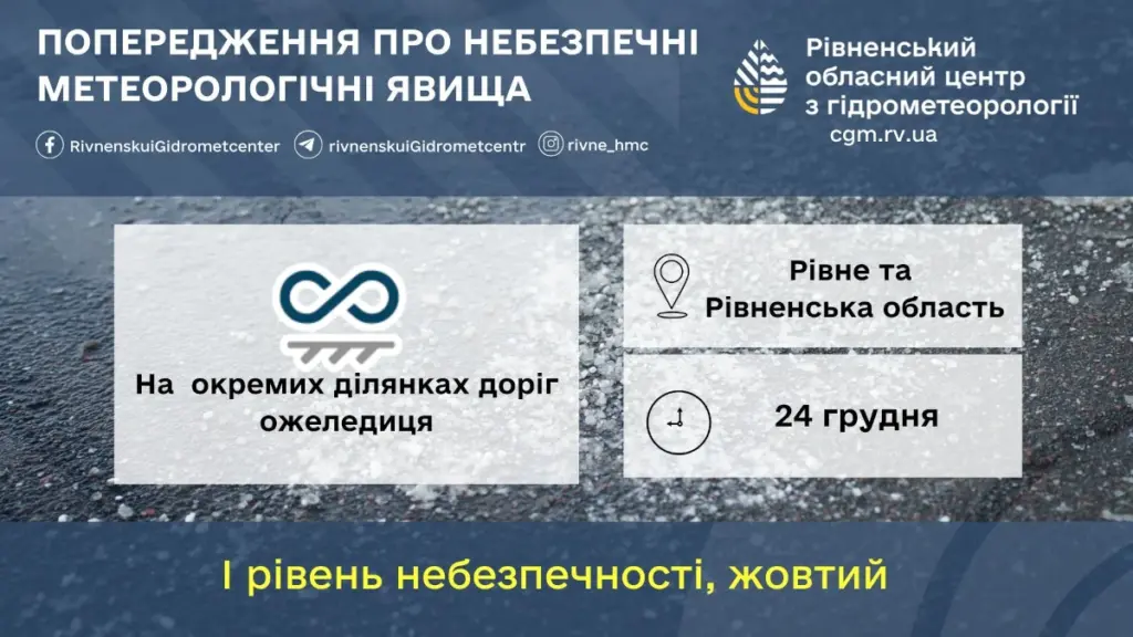 Синоптики надали прогноз погоди для Рівненщини на 24 грудня. У середу буде мінлива хмарність. Вночі місцями невеликий сніг, вдень без опадів. Через ожеледицю на окремих ділянках доріг оголошено I рівень небезпеки.