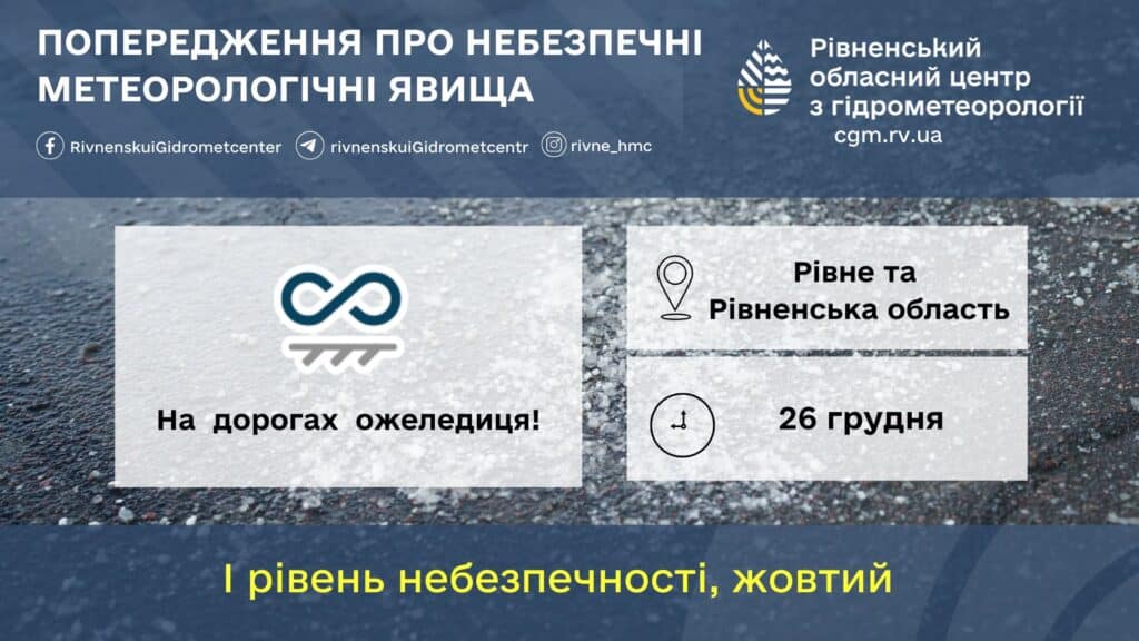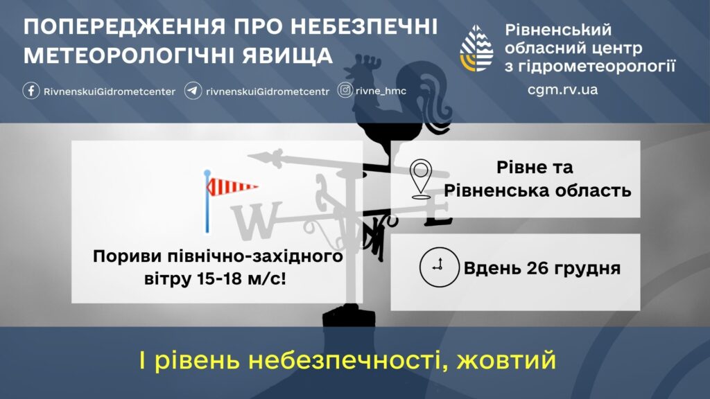 Синоптики надали прогноз погоди для Рівненщини на 26 грудня. У п’ятницю буде хмарно з проясненнями. Вночі без істотних опадів, вдень невеликий сніг та мокрий сніг. Через ожеледицю і пориви вітру оголошено I рівень небезпеки.
