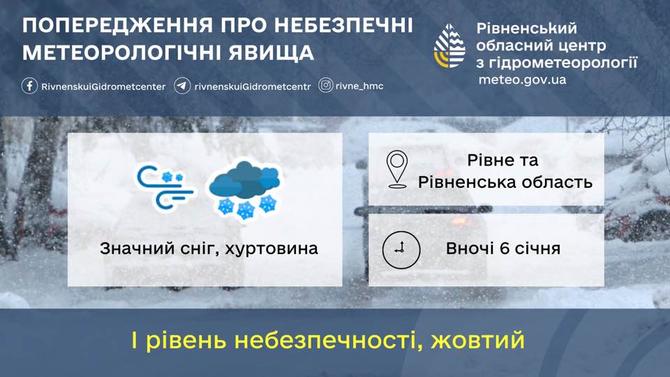 Синоптики надали прогноз погоди для Рівненщини на 6 січня. У вівторок буде хмарно. Вночі значний сніг і хуртовина. Вранці та вдень помірний сніг зі слабким налипанням і ожеледдю. На дорогах ожеледиця. По області оголошено I рівень небезпеки.
