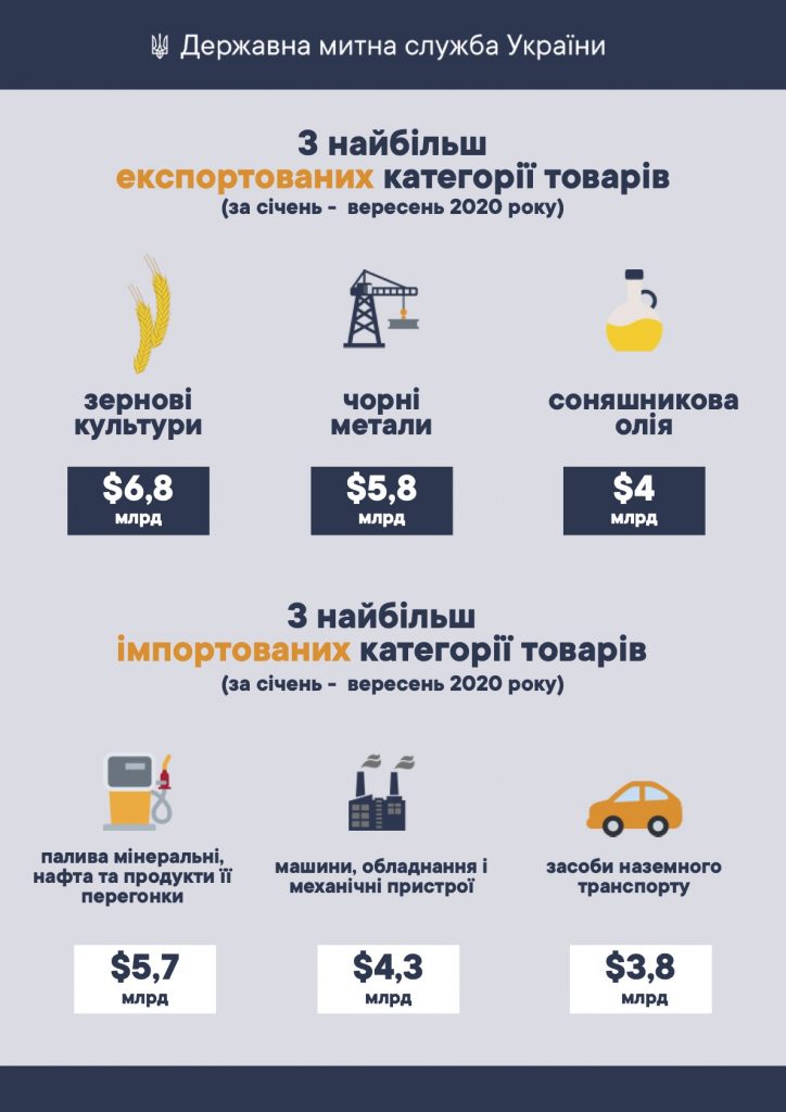 За 9 місяців поточного року в Україну імпортували товарів на понад $38 млрд (у порівнянні з аналогічним періодом 2019 р. імпорт зменшився на $5,1 млрд або на 11,8%. До трійки найбільш експортованих з України товарів належать – зернові, чорні метали, соняшникова олія.