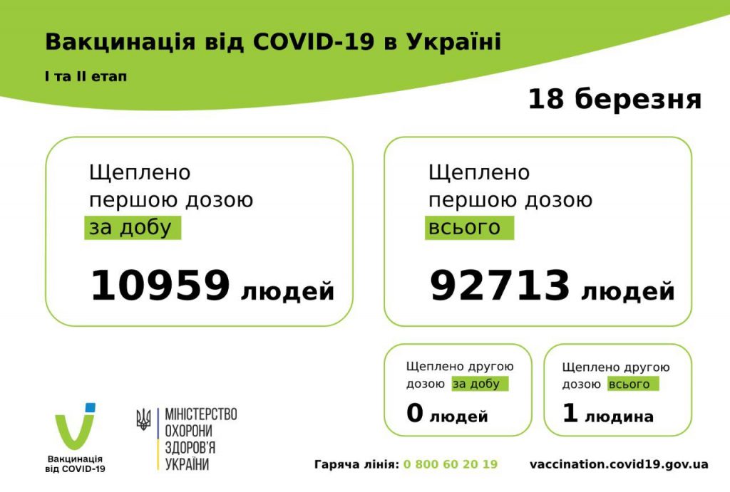 Від початку вакцинації проти Covid-19 було щеплено 92 714 людей, з них отримали 1 дозу – 92 713 людини, завершили вакцинацію (отримали 2 дози) – 1 людина.