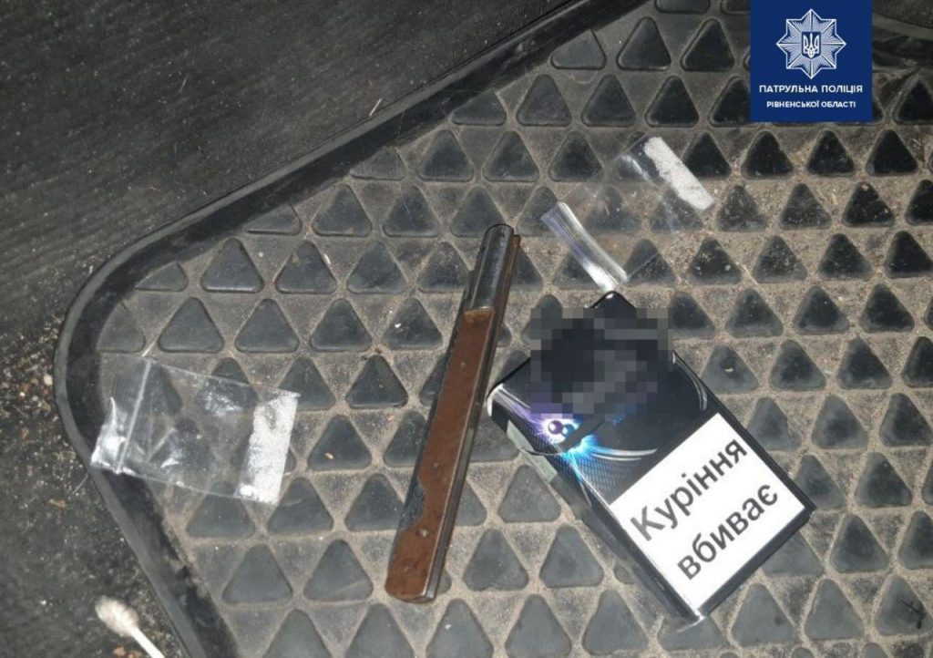 Вчора, в обід, в провулку Шпанівському під час патрулювання, екіпаж зупинив чоловіка, який намагався змінити напрям руху, коли побачив патрульне авто. Рівнянин явно нервував, тому патрульні вирішили його перевірити. В сумці 37-річного чоловіка виявили поліетиленові пакетики з речовинами, схожими на наркотичні, а також трубку для вживання наркотичних засобів.