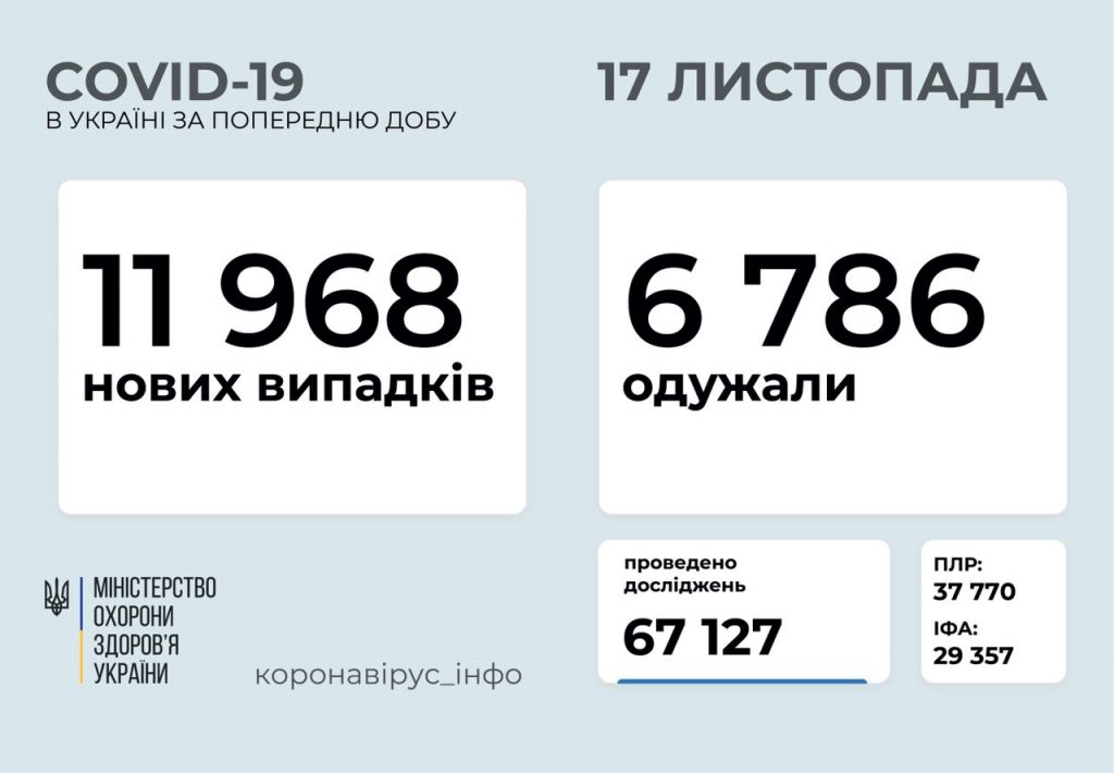 11 968 нових випадків коронавірусної хвороби COVID-19 зафіксовано в Україні станом на 17 листопада 2020 року. Зокрема, захворіли 516 дітей та 565 медпрацівників.