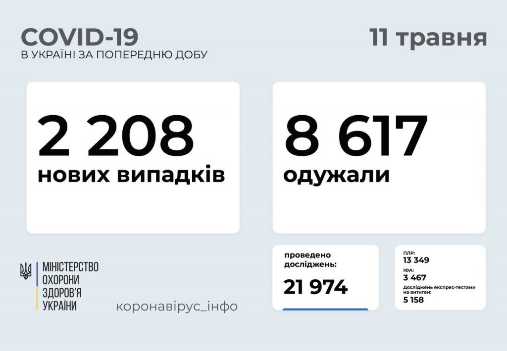 2 208 нових випадків коронавірусної хвороби COVID-19 зафіксовано в Україні станом на 11 травня 2021 року. Зокрема, захворіли 89 дітей та 34 медпрацівники.