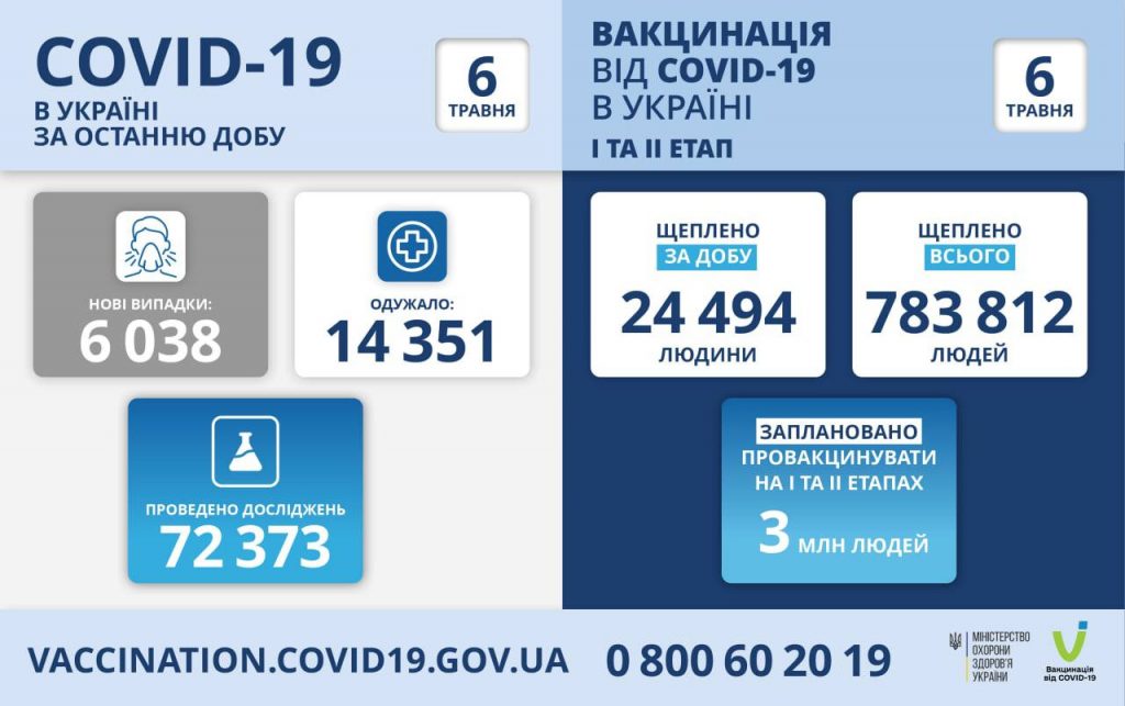 6 038 нових випадків коронавірусної хвороби COVID-19 зафіксовано в Україні станом на 6 травня 2021 року. Зокрема, захворіли 271 дитина та 113 медпрацівників.