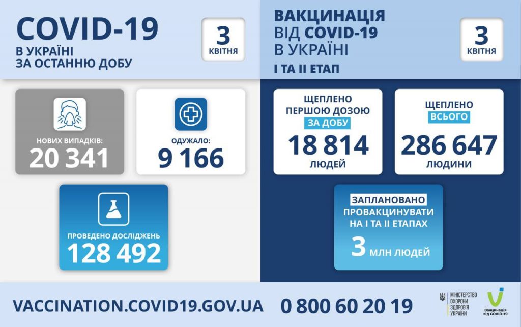 20 341 новий випадок коронавірусної хвороби COVID-19 зафіксовано в Україні станом на 03 квітня 2021 року. Зокрема, захворіли 809 дітей та 473 медпрацівники.