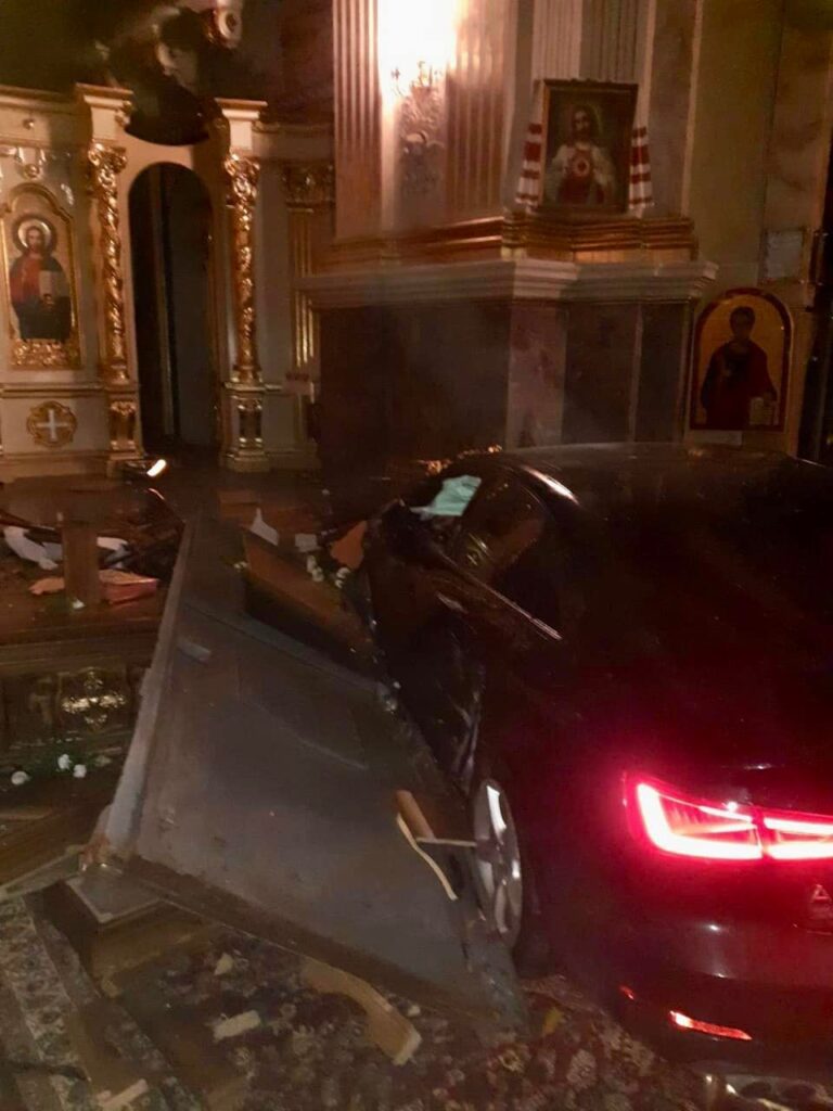 Виїхавши на виклик, працівники поліції встановили, що 35-річна жителька Тернополя, керуючи автомобілем марки «Ауді», знісши центральні металеві двері Катедрального собору, заїхала всередину культової споруди та пошкодила церковне майно.