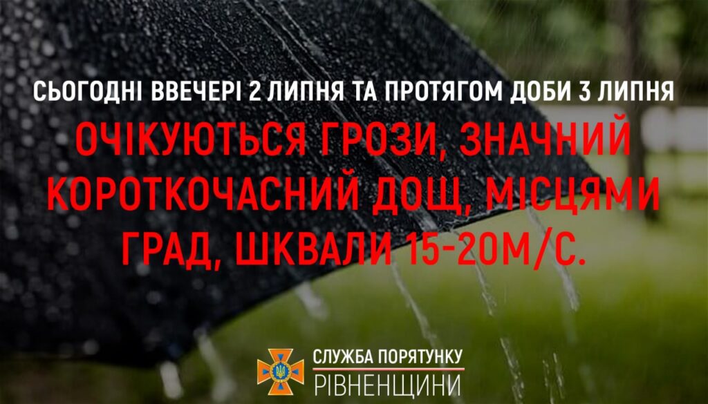 За інформацією обласного гідрометеоцентру сьогодні ввечері 2 липня та протягом доби 3 липня очікуються грози, значний короткочасний дощ, місцями град, шквали 15-20м/с.