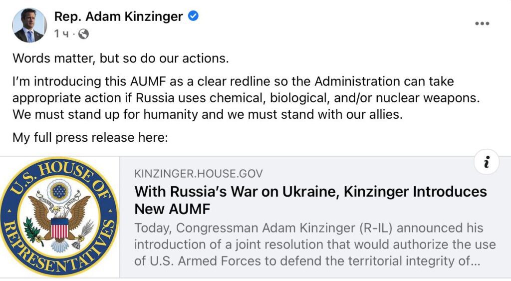 «Я представляю цей дозвіл на застосування військової сили (AUMF – Authorization for Use of Military Force) як чітка червона лінія, щоб Адміністрація могла вжити відповідних заходів, якщо росія використовує хімічну, біологічну та/або ядерну зброю. Ми повинні стати на захист людства та підтримати наших союзників», – написав Кізінгер.