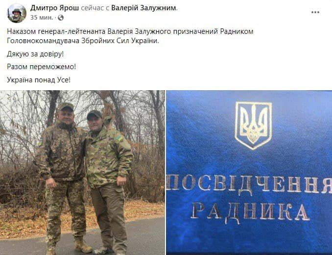 “Наказом генерал-лейтенанта Валерія Залужного призначено радником головнокомандувача Збройних сил України. Дякую за довіру! Разом переможемо!”, – написав Ярош.