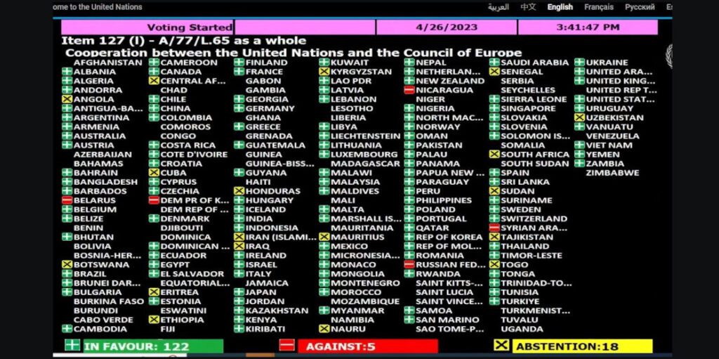 «Генасамблея 122 голосами за і 5 голосами проти ухвалила резолюцію про співпрацю ООН та Ради Європи. Спроба рф зняти згадку про агресію щодо України провалилася в ГА. Проти резолюції проголосували 5 відомих борців з правами людини – рф, білорусь, Нікарагуа, Сирія, КНДР», – написав у Твіттері постійний представник України в ООН Сергій Кислиця.