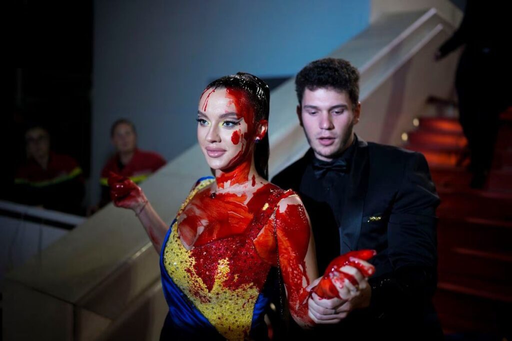 Ілона вийшла на червоний хідник у сукні в кольорах українського прапора й облила себе червоною фарбою.