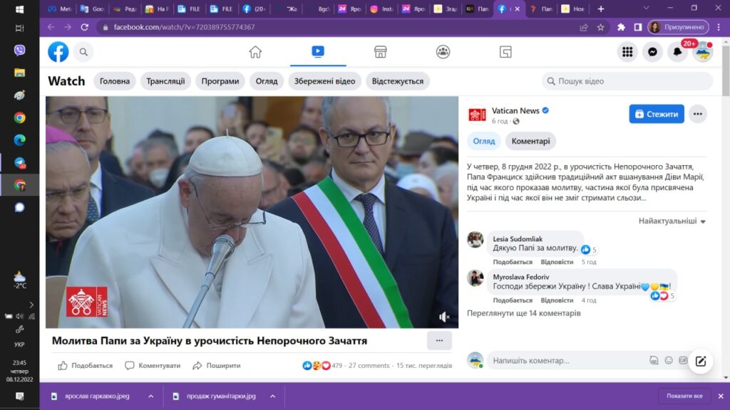 Папа Римський Франциск 8 грудня заплакав, згадавши про страждання українців під час традиційної молитви в центрі Риму.