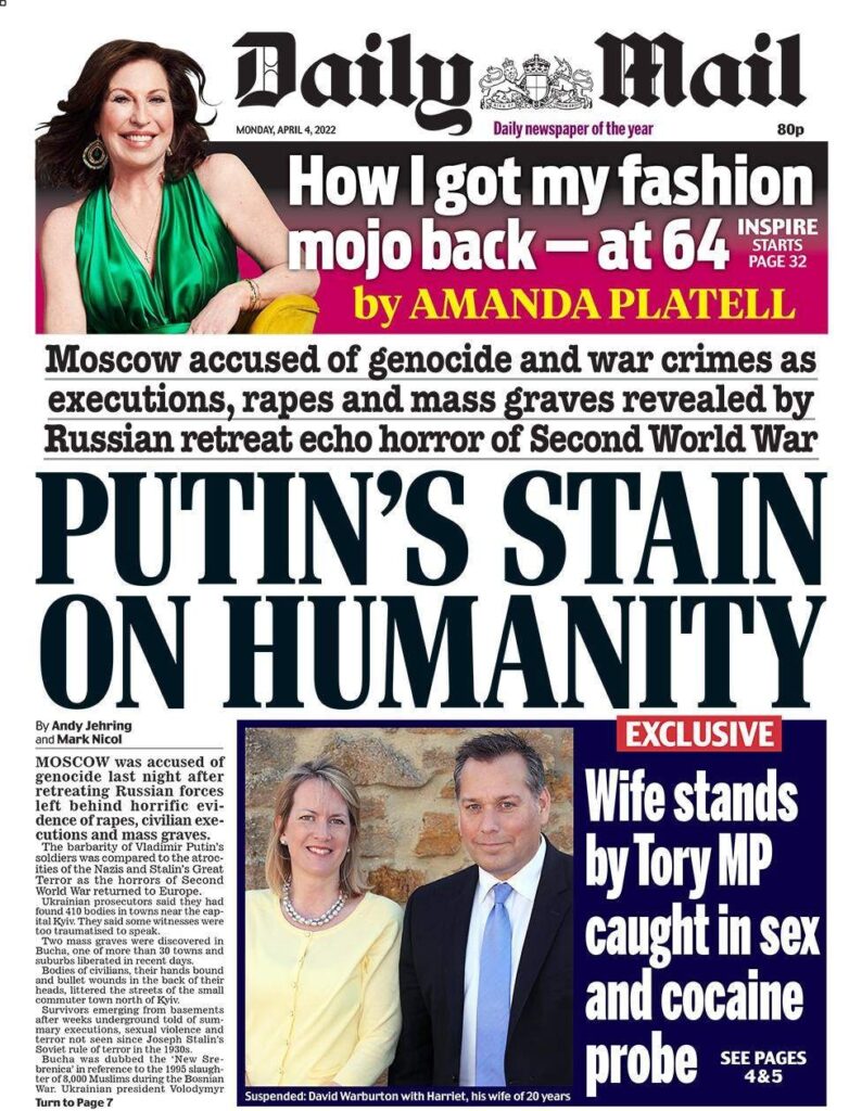 Зокрема, в сьогоднішніх випусках про звірства російських окупантів повідомляють на перших шпальтах таких авторитетних світових ЗМІ, як Daily Mail, The Times, The Guardian та ін.